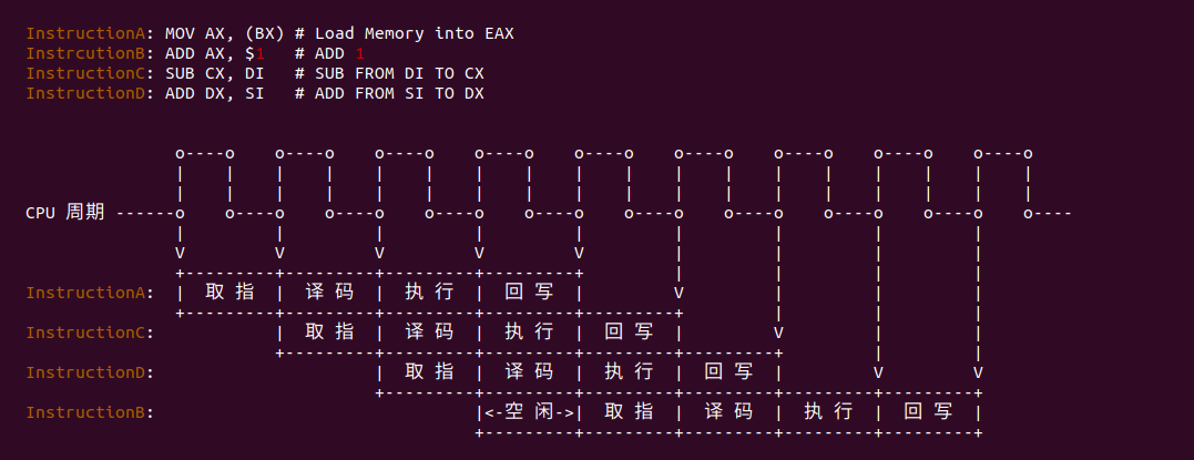在按顺序执行的情况下,一旦遇到指令依赖的情况,流水线就会停滞,例如 InstructionB 依赖 InstructionA 的结果,那么在 InstructionA 执行完之前 InstructionB 无法执行,这会让流水线的执行效率大大降低. 例如上图由于 InstructionB 依赖 InstructionA 的结果,导致剩余三条流水线多出现多个空闲周期.