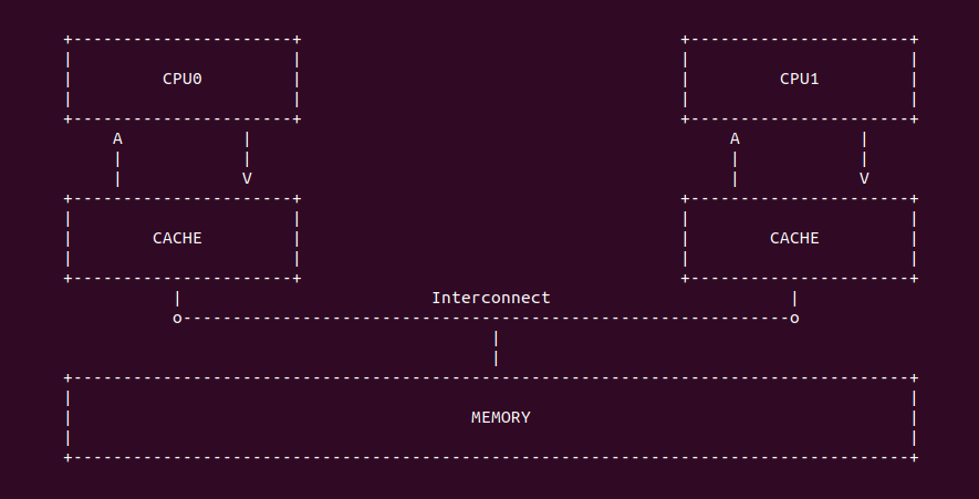 - A: CPU0 在 CACHE 中查询 A 是否被缓存,结果发现 CACHE Miss
