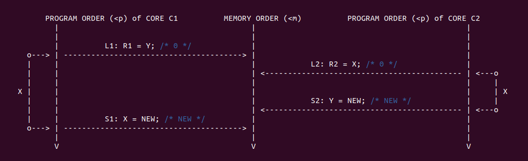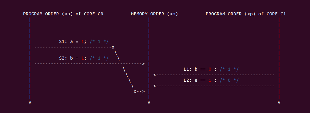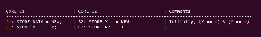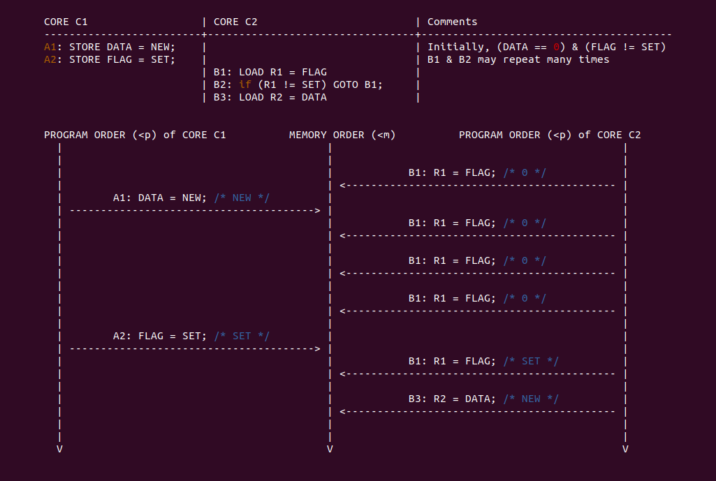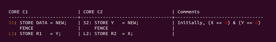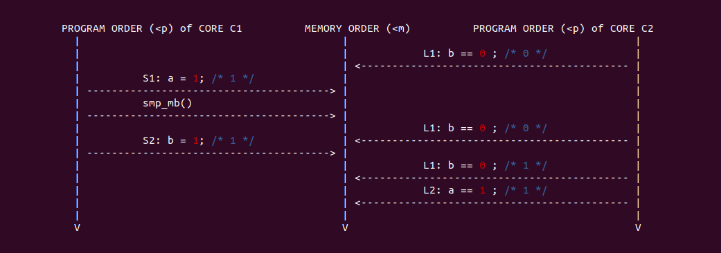 通过上面的场景分析,按预期 curr_nr 的值是与 element 在 elements[] 里一一映射,但可以看到 CPUB 读到了 curr_nr 的旧值和 element 的旧值,导致结果与预期不符合. 从 CPUB 的角度看,CPUA 的两条写指令乱序了,CPUA 先更新了 element 的值,然后再更新 curr_nr 的值,这会让 CPUB 读到 curr_nr 旧值. 另外从 CPUA 的角度来看,CPUB 的两条读指令乱序了,CPUB 先读了 curr_nr 的旧值,在读到 element 的旧值. 两种情况下结果与预期不符合.
