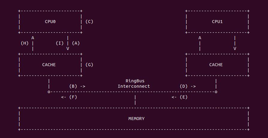- E: CPU1 收到 Read Invalidate 消息之后,立即将 A 对应的 CACHE Line 置为 Invlidate,并将 A 对应的 CACHE Line 副本和 Read Invalidate ACK 发送给 RingBus