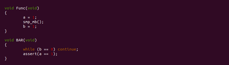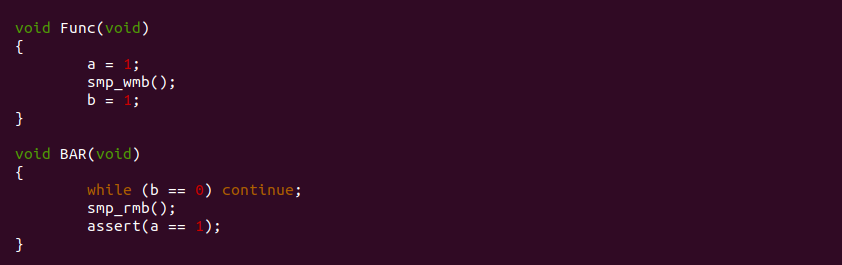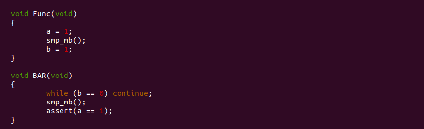 __split_huge_page_tail 函数的作用是将一个大页中的尾页(Tail Page) 从原先的大页中分离出来,使其称为一个独立的页。上图为代码逻辑,在分离 Tail Page 过程中可以看到,函数先将 Tail Page 的 flags 标志进行修改,其复制了原先大页的标志,然后再加上一些特有的标志,在修改完毕之后调用 smp_wmb() 写屏障,最后在调用 clear_compound_head() 函数, 以此完成剥离. 这里使用 smp_wmb() 标志的含义是告诉其他 CPU 或者内核线程,该 Tail Page 的 flags 修改完毕之后才调用 clear_compound_head() 函数,clear_compound_head() 函数执行完 Tail Page 剥离完成,其他内核线程此时如果访问 Tail page 的 page->compound_head 会发现其为 0, 因此该 Page 已经变成了一个独立的物理页。从这个案例可以看出 smp_wmb() 写屏障对一段写操作进行了无锁保序,其他内核线程只要看到这段写操作完成,那么可以无锁访问到最新的共享资源.