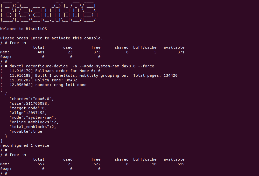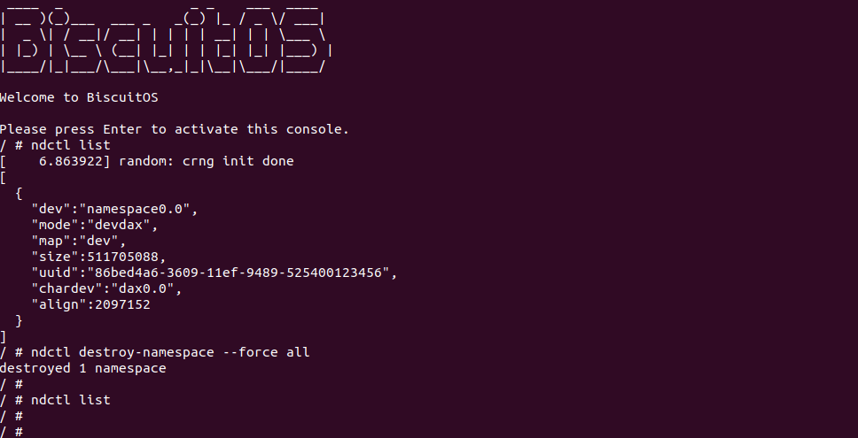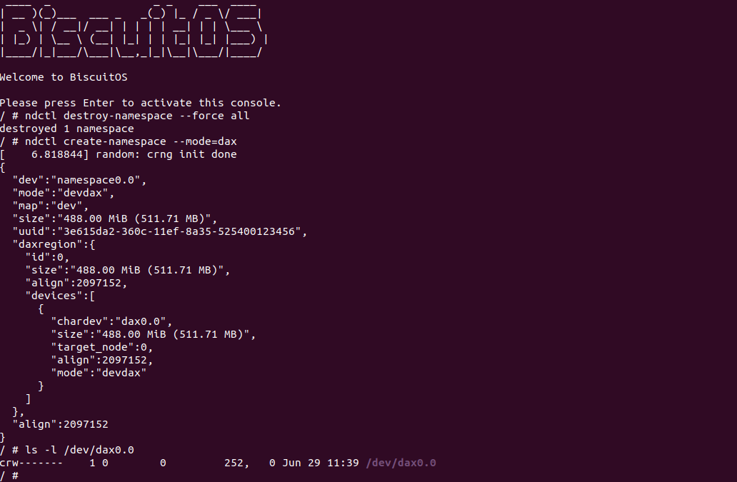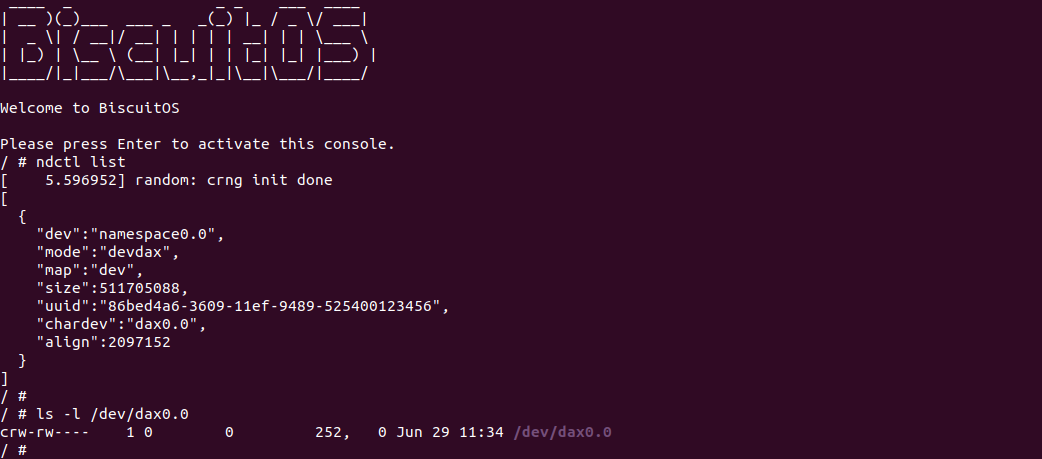BiscuitOS 启动之后,使用 ‘ndctl list’ 可以看到 PMEM 设备相关的信息, 可以看到当前系统 PMEM 设备的拓扑结构. 并且会在 /dev 目录下生成 dax0.0 设备节点.
