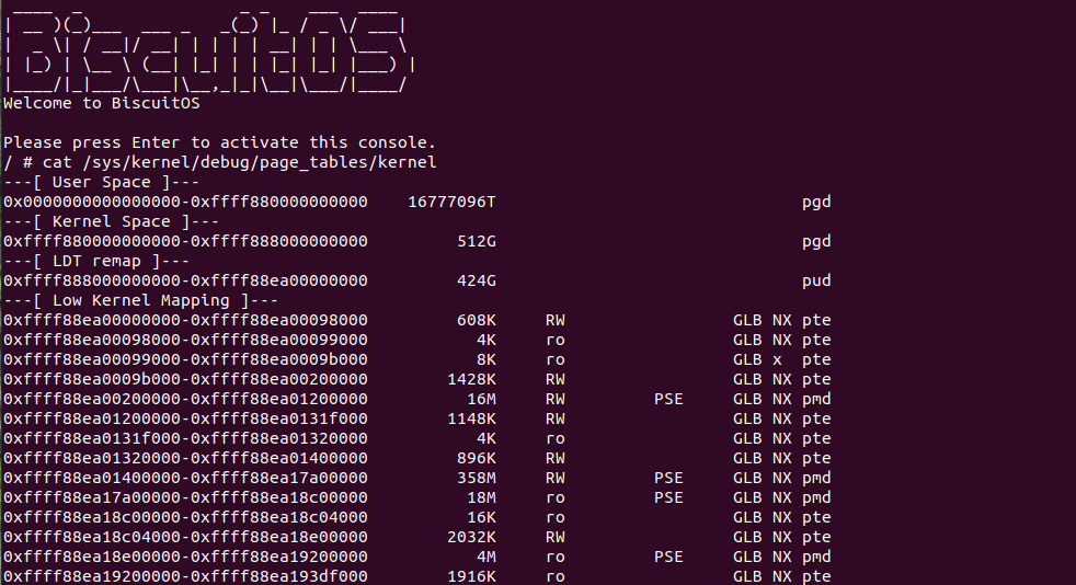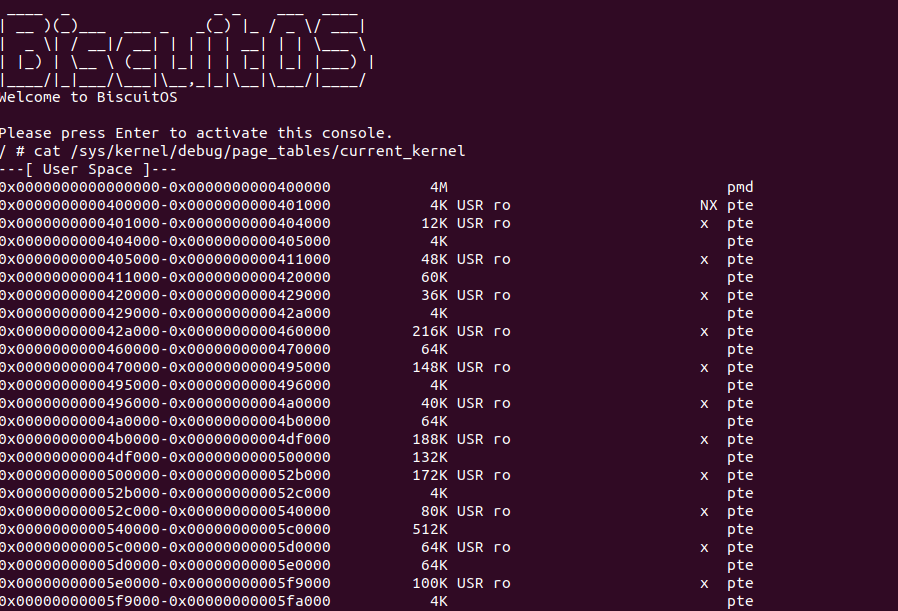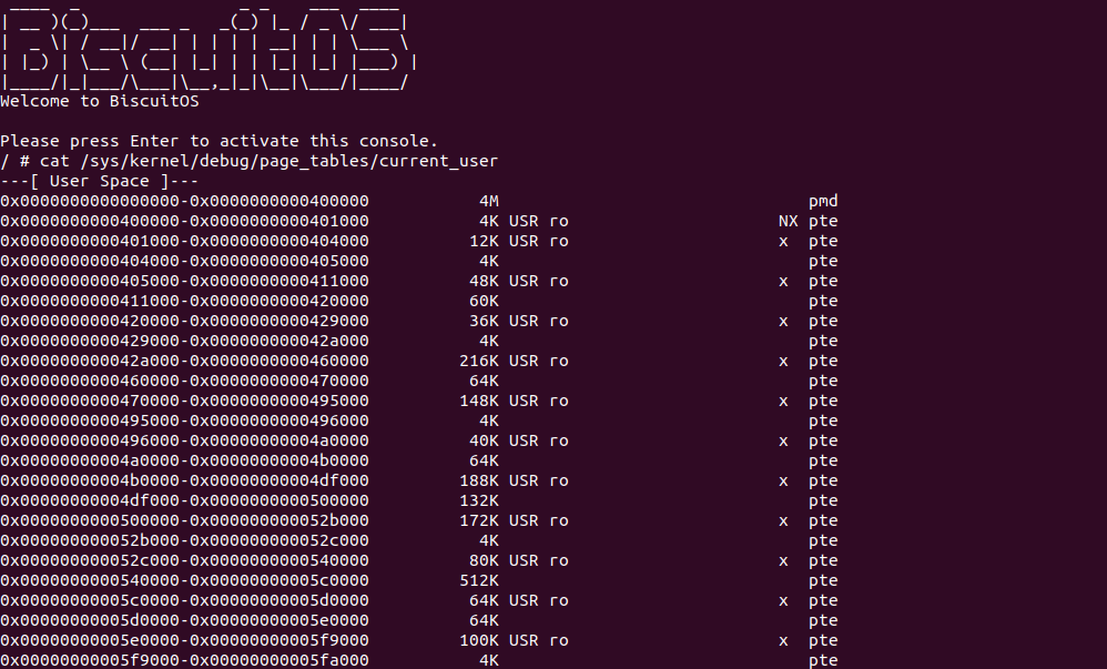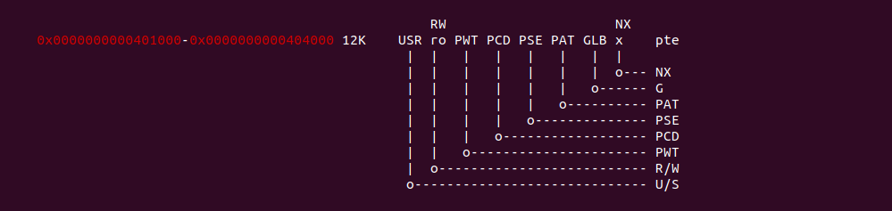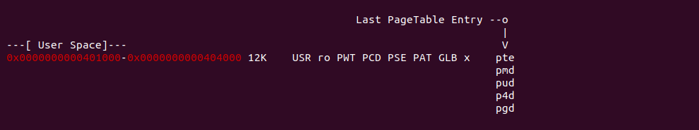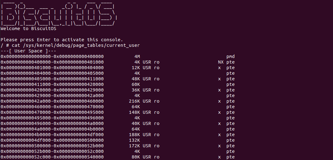 例如当查看 /sys/kernel/debug/page_tables/current_user 文件时,可以看到获得了用户空间所有虚拟内存对应的页表,其信息包括下面几个部分(e.g. “0x0000000000405000-0x0000000000411000 48K USR ro x pte”):
