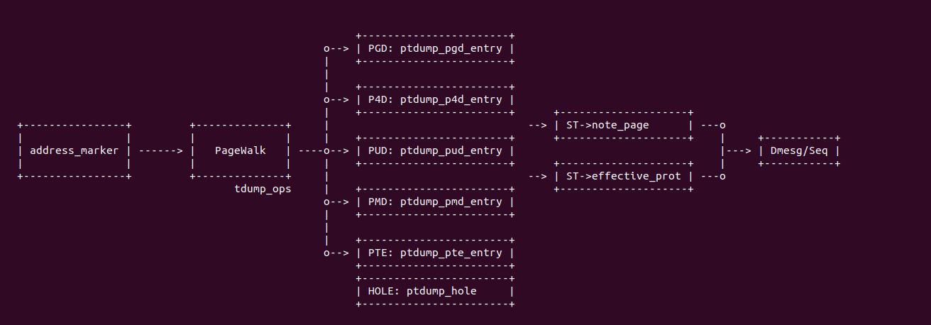 PTDUMP 机制原理如上图,由于每个架构的虚拟地址空间布局不一样,因此每个架构都实现了各自的 PTDUMP 接口,但逻辑上基本一致, 接下来以 X86 为例进行讲解:
