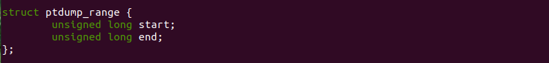struct ptdump_range 数据结构描述虚拟内存一段 Region 的范围, start 成员描述 Region 的起始虚拟地址, end 成员描述 Region 的结束虚拟地址. PTDUMP 机制 输出页表内容时将虚拟内存划分成不同的 Region,例如 User Space、Kernel Space 以及 LDT Remap 等,该数据结构就是用来描述这些区域的范围.
