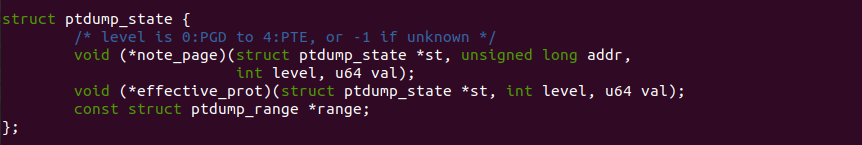 struct ptdump_state 数据结构用于记录 PTDUMP 过程中的中间态数据,其 note_page 成员指向具体架构提供的记录页表内容函数,也就是每个架构都需要实现自己的记录页表内容函数,并且在遍历到每一级页表时,如果该页表是最后一级页表或者空页表,那么该函数会被调用,另外该成员的 level 参数指明了页表的级数,level 为 4 的时候表示 PGD Entry,level 为 1 的时候表示 PTE Entry,-1 则表示 Unknow 的状态; effective_prot 成员指向具体架构提供的有效页表过滤函数,同理每个架构按需实现各自的页表过滤函数,并且在遍历每一级页表的时候就会被调用,其主要目的就是过滤一下每一级页表里无效的页表内容; range 成员则用于记录需要 DUMP 的虚拟内存区域.