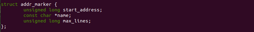 struct addr_marker 数据结构用于记录虚拟内存一段 Region 的信息,start_address 成员描述该虚拟内存区域的起始地址,name 成员描述该虚拟内存区域的名字,max_lines 成员控制该区域是否跳过显示.
