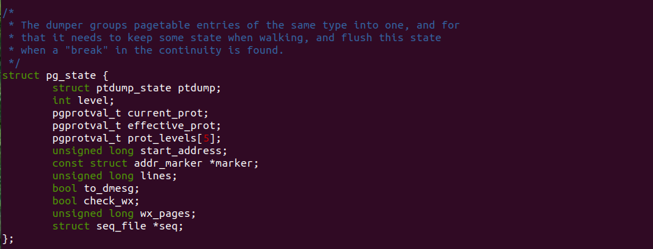 struct pg_state 数据结构是 X86 架构提供了由于记录 PTDUMP 过程中使用的数据,以便记录 X86 架构的页表内容,那么其成员含义如下: