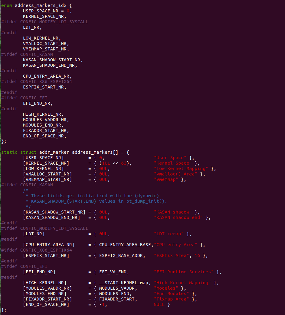 enum address_markers_idx 枚举体由于定义 PTDUMP 机制可以 DUMP 的虚拟内存区域,其配合 struct addr_marker 数据结构一同使用. address_markers[] 数组是 X86 架构定义的虚拟内存区域信息,从定义中可以看到每个区域的名字以及起始虚拟地址,其在定义的时候,所有区域的起始虚拟地址都为 0,可以从其名字知道对应的 address_markers_idx 的含义.
