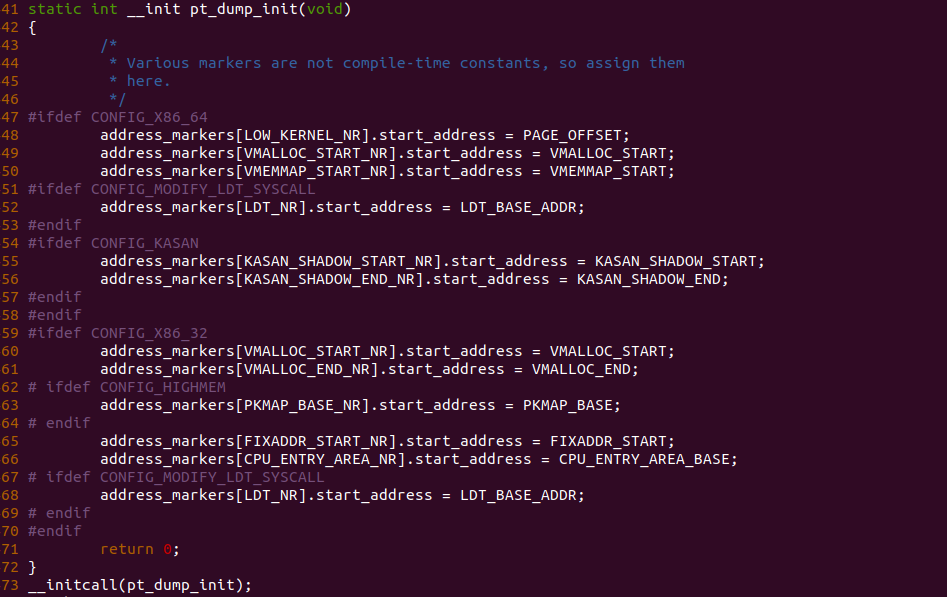 当内核启动过程是,__initcall() 函数会调用 pt_dump_init() 函数对 PTDUMP 机制进行初始化. 函数只做了一个事,就是为 address_markers[] 数组里的虚拟内存区域设置起始虚拟地址,从这里可以知道 Linux 内核对每个区域起始虚拟地址所使用的宏,例如内核线性映射区域的起始地址就是 PAGE_OFFSET, 再如 VMALLOC 区域的起始虚拟地址为 VMALLOC_START.