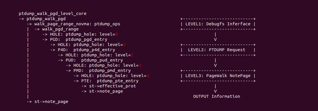 - 输出内容: PageWalk 机制遍历完所有页表之后,最后就是将其通过 Dmesg 或者 Seq 机制显示到用户空间.