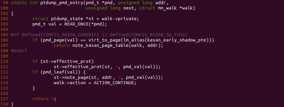 ptdump_ops 提供的回调函数处理逻辑基本相同,以 ptdump_pmd_entry 为例进行讲解,当 PageWalk 机制遍历到 PMD 页表时,并且 PMD Entry 不为空,那么 ptdump_pmd_entry 函数就会被调用,函数首先调用 READ_ONCE() 函数并发的读取一次 PMD Entry 的值,如果函数在 110 行检查到架构的 st 实现了 effective_prot 接口,那么调用对应的 effective_prot() 函数,并且第二个参数传入 3,接着函数在 112 行调用 pmd_leaf() 函数检测到 PMD 是叶子,那么此时 PMD Entry 为最后一级页表,那么调用 st 提供的 note_page 接口来记录页表内容,结论完毕后将 PageWalk 机制的 action 设置为 ACTION_CONTINUE, 以此继续遍历下一个 PMD Entry.