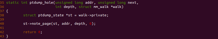 ptdump_ops 提供了 pte_entry 回调函数 ptdump_hole, 当遍历到某一级页表时,如果页表为空,那么该回调函数会被调用,其通过 depth 参数来区分目前是哪一级页表为空,PGD 时 depth 为 0, PTE 时 depth 为 4. 可以看到当页表为空是,调用 note_page 记录页表内容.
