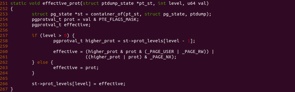 不同架构实现 effective_prot 有所不同,上图是 X86 架构的实现,当 257 行检测到 level 小于等于 0,那么表示页表是 PGD Entry,那么直接将 prot 作为有效的页表; 反之其他级的页表,其会将上一级页表的 effective 和当前 prot 进行与操作,以此确保向上一级页表对齐。最后再将有效的页表内存存储在 st->prot_levels[level] 里.