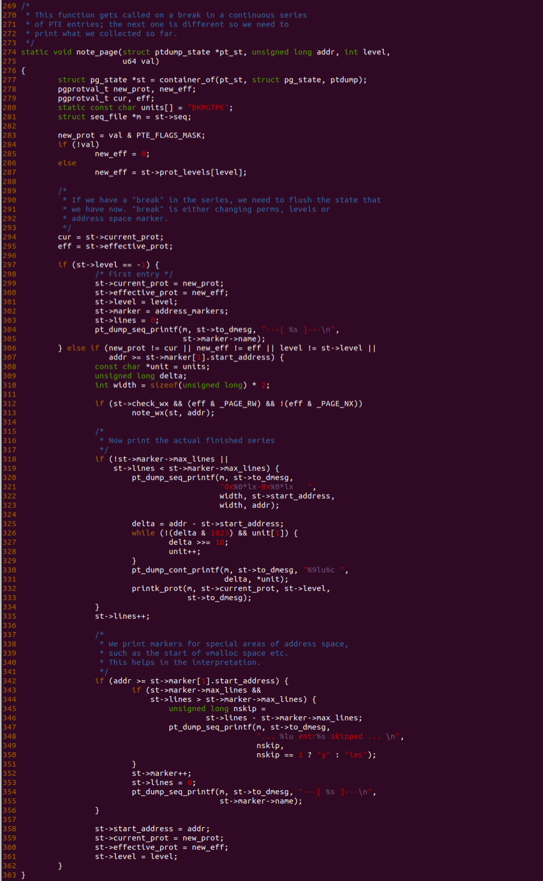 不同架构实现 note_page 函数有所不同,上图是 X86 架构的实现,其作用是记录页表的内容,看着代码行数很多,其实函数就在做一个事情,将页表内容解析出来,然后存储到指定的缓存里. 首先是 304-305 和 354-355 行用于输出通过虚拟内存 Region 的名字,320-323 行用于输出 Region Entry Range 信息, 325-331 行用于输出区域的大小字符串,332-333 行用于输出 PageTable Attribute 字段字符串以及最后一级页表信息. 这些信息通过 pt_dump_seq_printf 函数控制输出方向,可以输出到 dmesg 也可以输出到 seq_file 缓存.