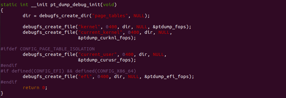 PTDUMP 机制在内核启动过程中调用 pt_dump_debug_init() 函数注册了 “/sys/kernel/debug/page_tables” 目录,并在该目录下注册了 kernel、current_kernel、current_user 和 efi 四个伪文件.