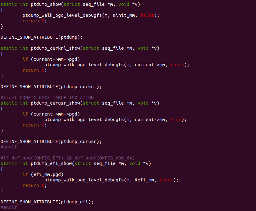 PTDUMP 机制为 4 个伪文件提供 SHOW 属性,因此四个伪文件只读,那么当读取 kernel 文件时,ptdump_show() 函数会被调用,可以看到其核心调用 ptdump_walk_pgd_level_debugfs() 函数,读取其他文件也类似,只是传递给 ptdump_walk_pgd_level_debugfs 函数的参数不同而已,对于 kernel 其 mm 是 init_mm, efi 其 mm 是 efi_mm, 而 current_kernel 和 current_user 的页表则是 current->mm.