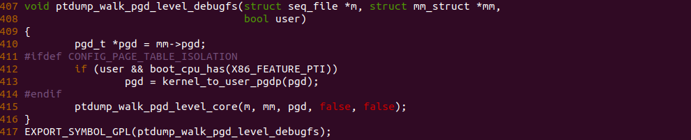 ptdump_walk_pgd_level_debugfs 函数是承接 Debugfs 接口文件的请求,然后将其进行转换传递给 PTDUMP 核心层,可以看到函数首先获得 PGD,然后根据参数 user 判断虚拟内存的范围,然后最终调用 ptdump_walk_pgd_level_core() 函数.