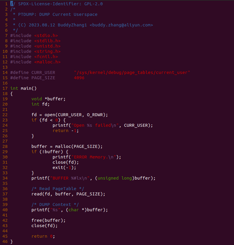 实践案例有一个用户空间程序构成,其核心逻辑是分配一块 Buffer,然后从 “current_kernel” 文件读取页表的内容到 Buffer 里,最后就是进行显示。程序在 22 行打开了 current_kernel 文件,然后在 28 行分配了 32K 的 Buffer,接着打印了 Buffer 的虚拟地址。实践案例在 38 行调用 read() 函数开始读取当前页表内容到 Buffer,然后在 41 行从 Buffer 里打印页表内容,打印完毕之后就是释放内存和关闭文件. 那么接下来在 BiscuitOS 上进行实践: