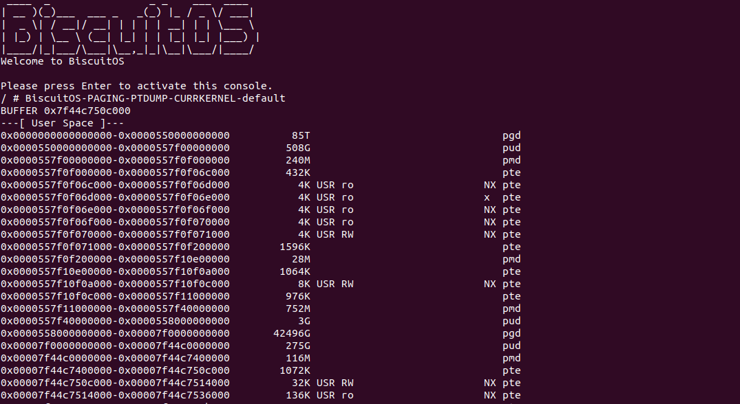 当 BiscuitOS 启动之后,直接运行 BiscuitOS-PAGING-PTDUMP-CURRKERNEL-default,可以看到 BUFFER 的虚拟地址 0x55f3ed5632a0,打印的信息有些长,其包括了用户空间虚拟地址页表,内核空间页表位于末尾,可以看到内核不同 Region 的页表信息,对开发者调试分析问题有很大帮助.