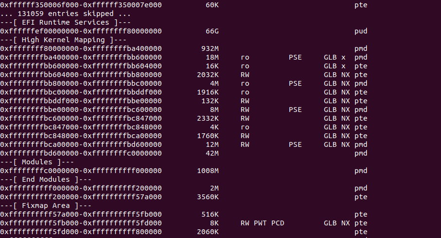 可以看到当执行该命令之后,PTDUMP 机制会输出 EFI 映射区的页表,也可能什么也不输出,这要看机器是已经在使用 EFI 固件了。