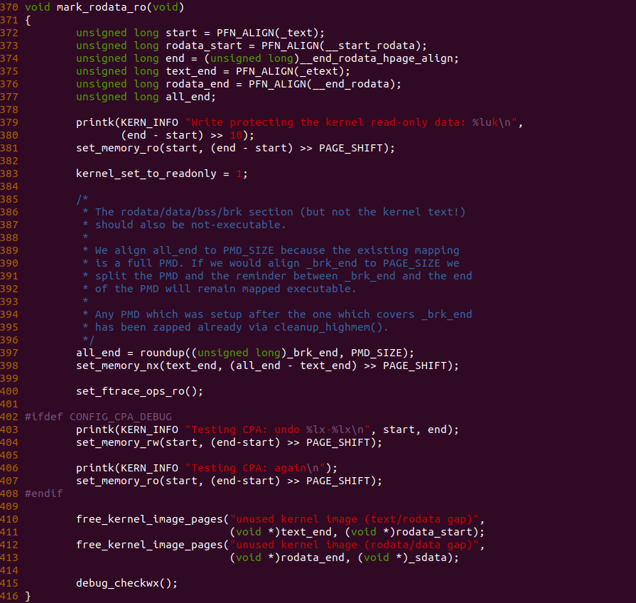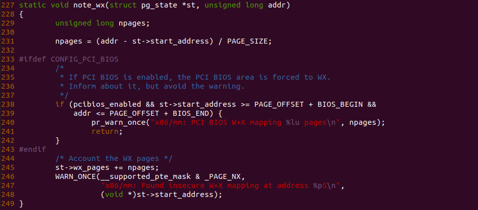 在 note_nx() 函数里是在 note_page 里检查到页表里包含 _PAGE_RW 但不包含 _PAGE_NX,那么 note_nx() 函数就会被调用,用于记录 WX 页表的信息,其通过 246 行的 WARN_ONCE() 函数进行报错,但这里仅仅是报错,没有阻止程序的继续运行,那么可以看到实践案例再将虚拟区域的 NX 标志置位之后,那么再次调用 debug_checkwx() 函数是并没有找到任何的 WX 区域,可以从打印的信息看出,其输出了字符串: x86/mm: Checked W+X mappings: passed, no W+X pages found.. 至此实践案例实践完毕,通过该实践案例可以在内核里使用 debug_checknx() 函数对内核空间虚拟区域进行检查, 已发现不符合要求的映射.