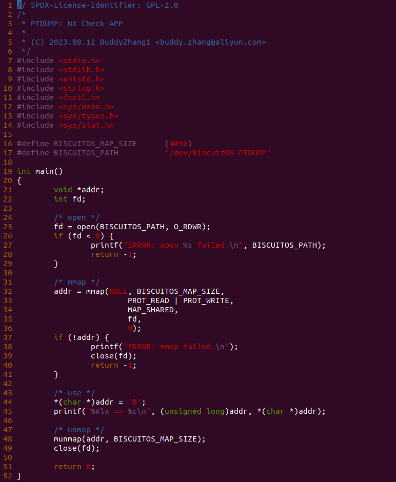 实践案例由两部分组成,其中一部分是一个应用程序,其目的是从 “/dev/BiscuitOS-PTDUMP” 设备节点上,通过 mmap 分配内存,然后使用这部分内存,使用完毕之后在释放.