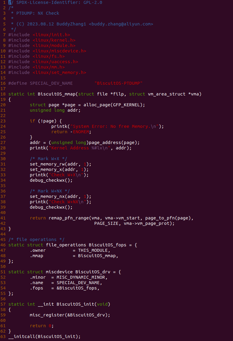 实践案例的另外一部分是一个内核模块,模块基于 MSIC 驱动构建,并向用户空间提供 “/dev/BiscuitOS-PTDUMP” 节点,节点实现了 mmap 接口,当用户空间调用 mmap 函数就会调用到 BiscuitOS_mmap() 函数,该函数首先分配一个物理页,并获得物理页对应的内核空间虚拟内存。接下来将这段虚拟内存构造成可写可执行的区域,于是在 31-32 行调用 set_memory_rw() 和 set_memory_x() 函数,接着在 34 行调用 debug_checkwx() 函数检查内核空间虚拟内存。最后再次将虚拟内存区域修改为非 WX 的区域,那么再次进行检查,于是在 37 行调用 set_memory_nx() 函数将该区域设置为不可执行的,接着在 39 行调用 debug_checkwx() 函数再次检查。检查完毕之后就是建立页表. 那么接下来在 BiscuitOS 上实践该案例: