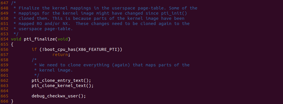 在 Linux 内核中,pti_finalize 函数用于完成页表隔离(Page Table Isolation,PTI)的初始化和收尾工作。页表隔离是一种安全性措施,旨在减轻 Spectre 漏洞的风险,特别是 Spectre Variant 2. 其在页表隔离完毕之后会调用 debug_checkwx_user() 函数对进程的用户空间和内核空间虚拟内存区域检查,如果发现存在可读写可执行的区域就进行报错,因为这样的区域是非法区域. debug_checkwx_user() 函数的功能要其作用,其首先要打开 CONFIG_DEBUG_WX 宏,然后系统硬件上支持 PTI 机制, 只有满足这两个条件才可能启用用户空间虚拟内存检查 WX 区域的能力.